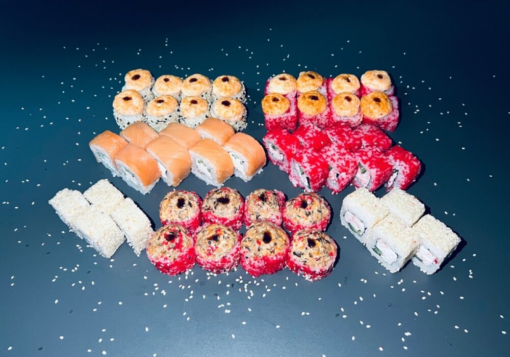 Филадельфия с огурцом, Калифорния в масаго, Хоккайдо, Шиитаке, Окунь запеченный, лосось унаги