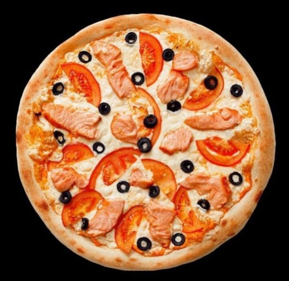 Лосось, помидоры, маслины, фирменный красный соус, сыр моцарелла