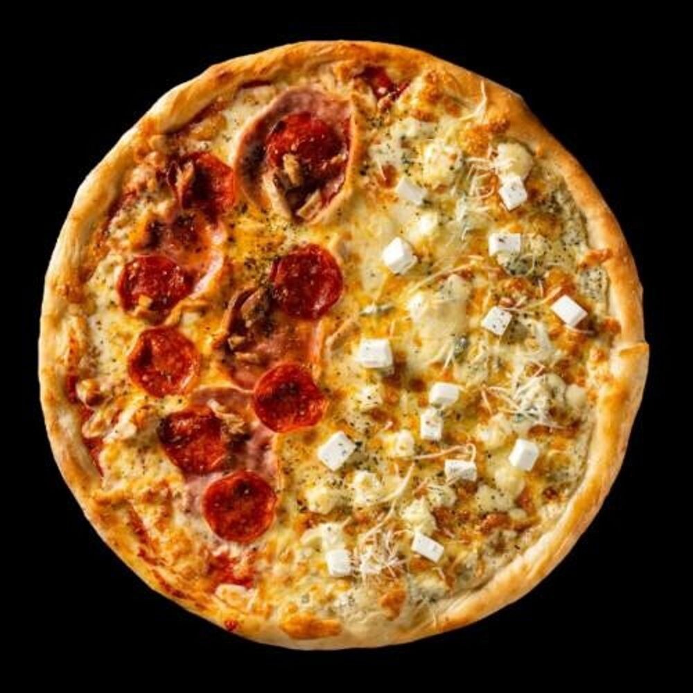 Вареная колбаса, пепперони,соус красный/Дор-блю,пармезан, фетакса, белый соус, сыр моцарелла