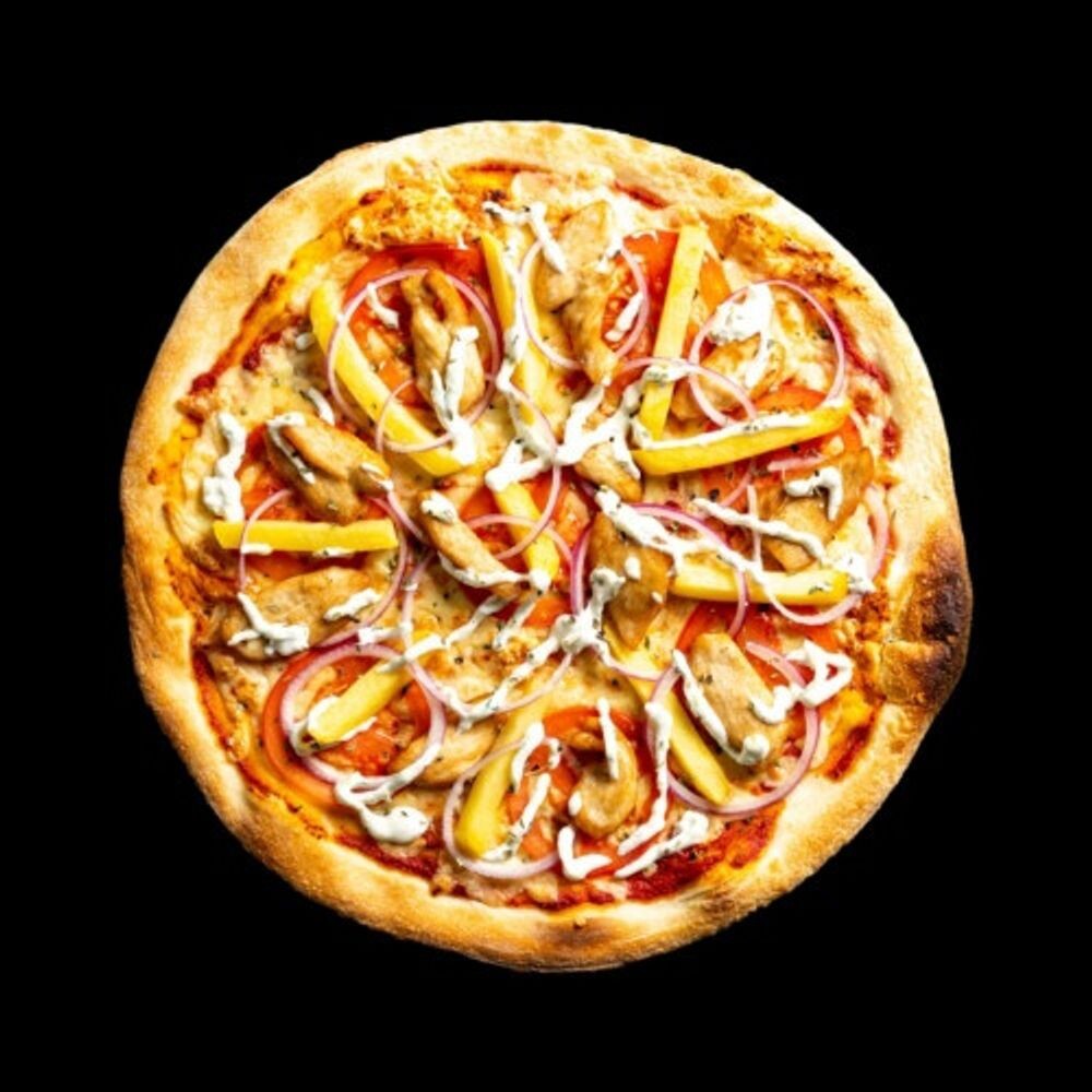 Курица, томаты, лук красный, картофель фри, фирменный красный соус, полита соусом дзадзыки, сыр моцарелла