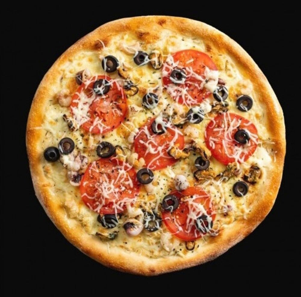 Морской коктейль (креветка, мидии), томаты, маслины, сыр моцарелла, фирменный белый соус с лососем