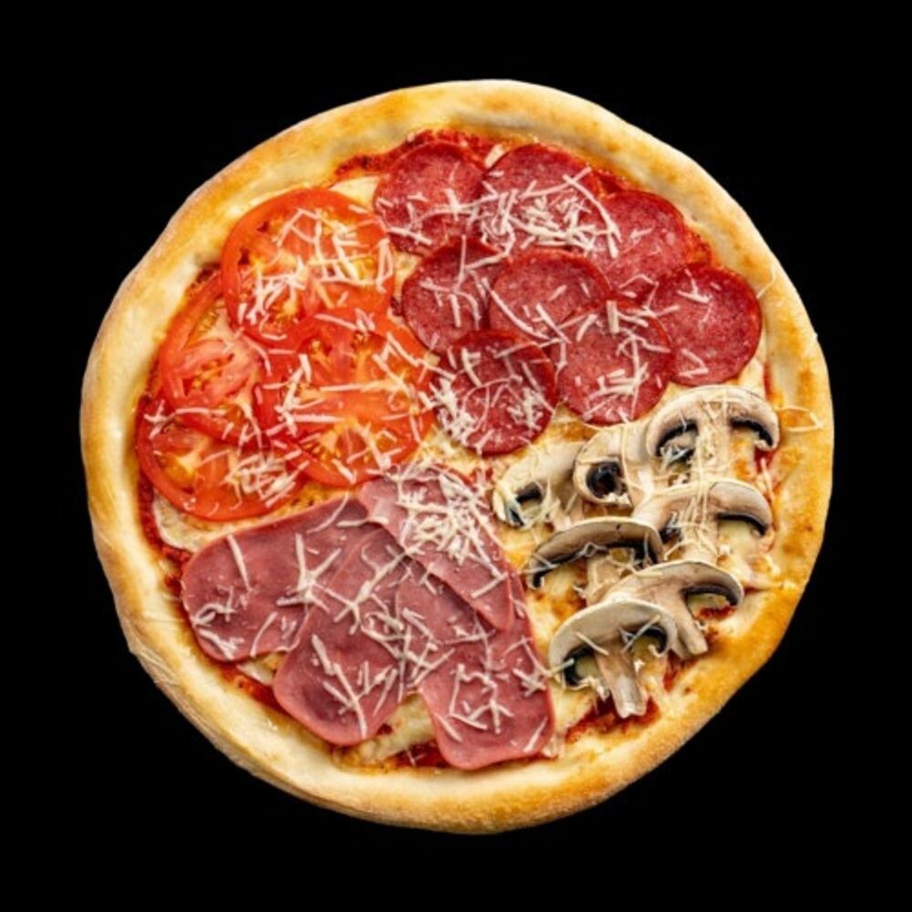 Пепперони , вареная колбаса, шампиньоны, томаты, сыр моцарелла, фирменный красный соус