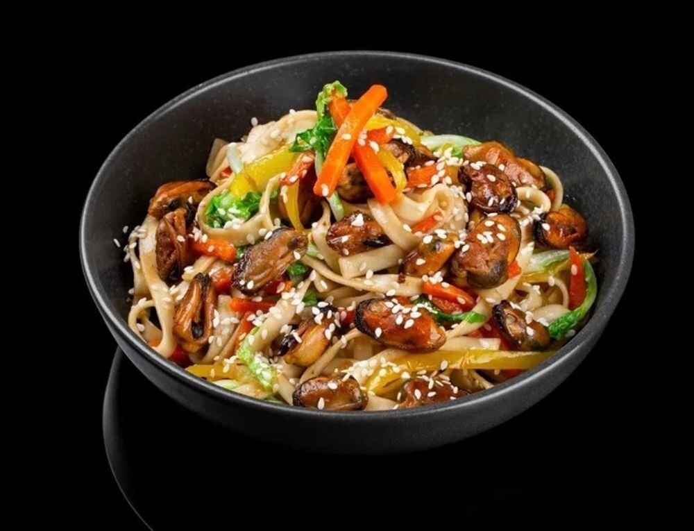 Лапша удон, лосось , креветка тигровая, мидди ,лук, перец, соус терияки
