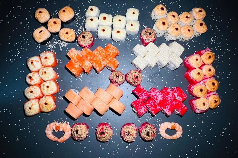 Филадельфия с огурцом, Марокко, Калифорния в масаго, Калифорния в кунжуте, Лосось унаги , Креветка Хот, Флорида,Шиттаке , Киото, Яки