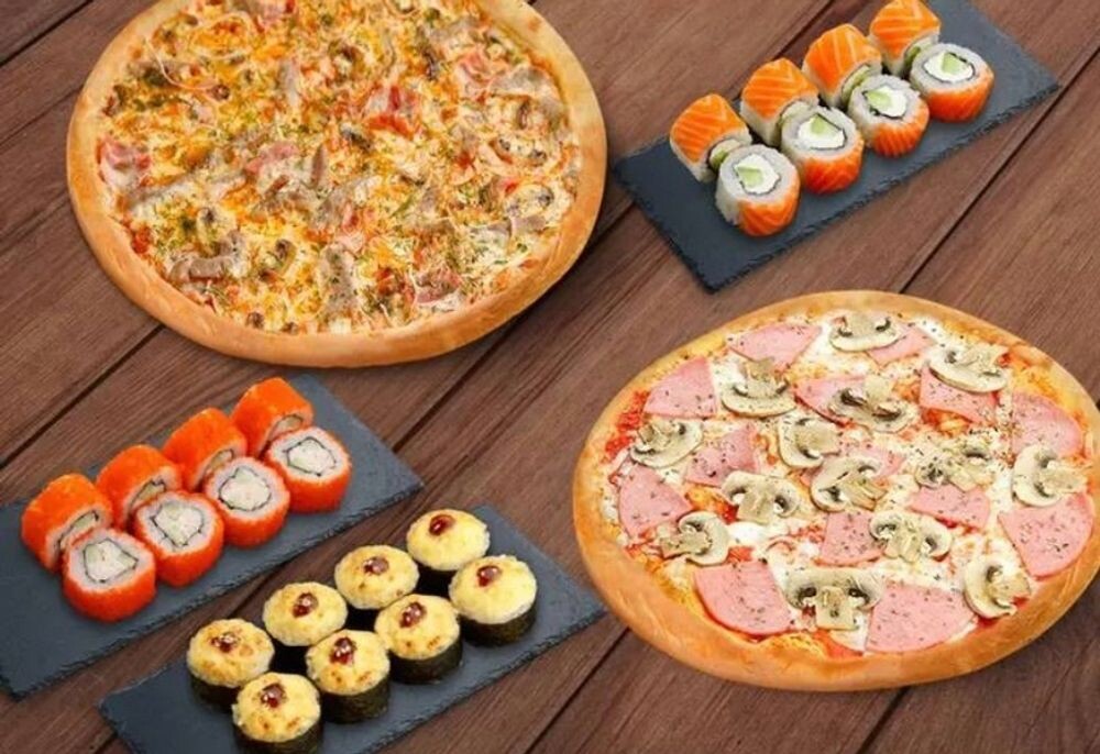 Пицца 32 см.: Мясная, Прошутто, Роллы: Калифорния с крабом, запеченный Акира, Филадельфия с огурцом