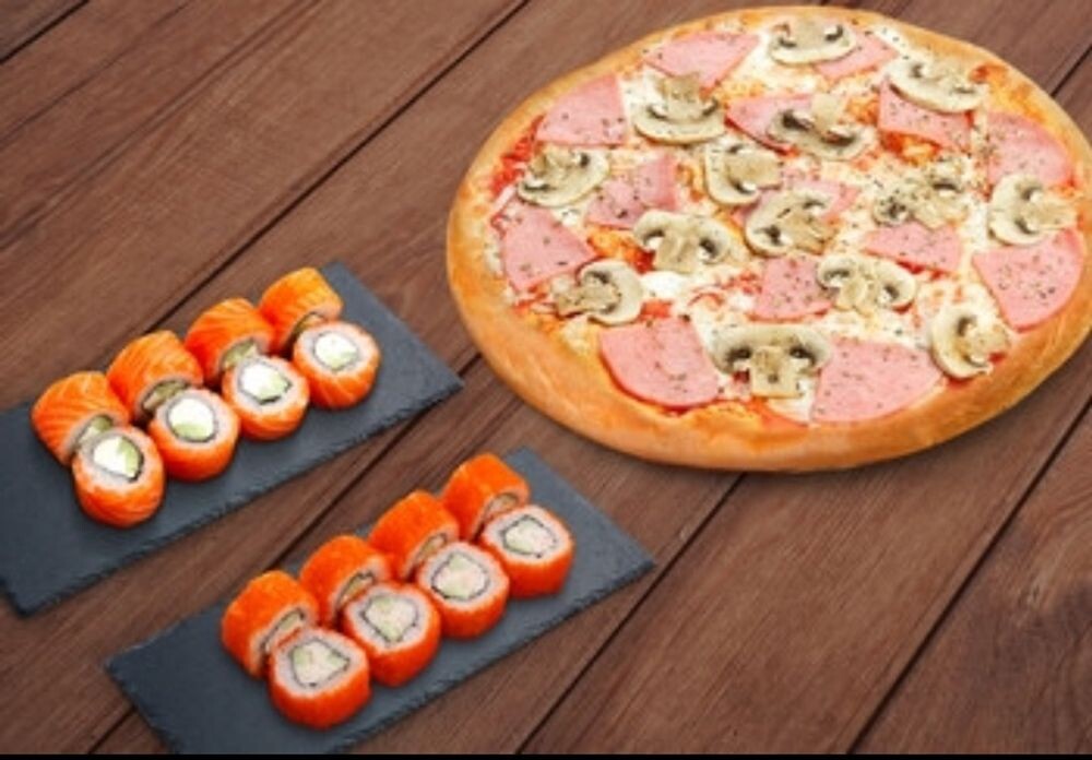 Пицца: Прошутто 32см, Роллы: Филадельфия с огурцом , Калифорния с крабом