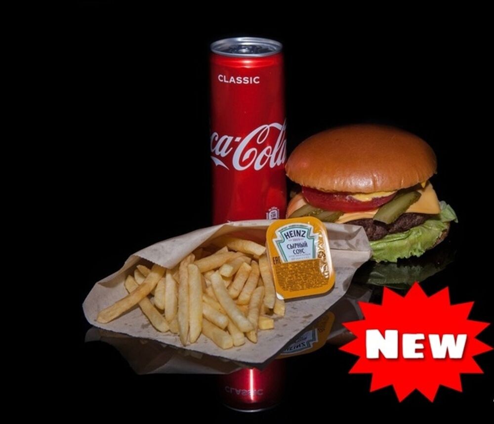 Чизбургер с говяжьей котлетой,картошка фри- 150 гр. , кола 0.3 ж/б кг