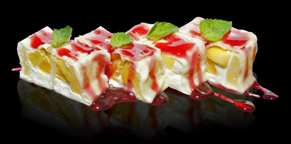 Тесто харумаки, сыр сливочный, банан, ананас, сироп шоколадный, сироп клубничный