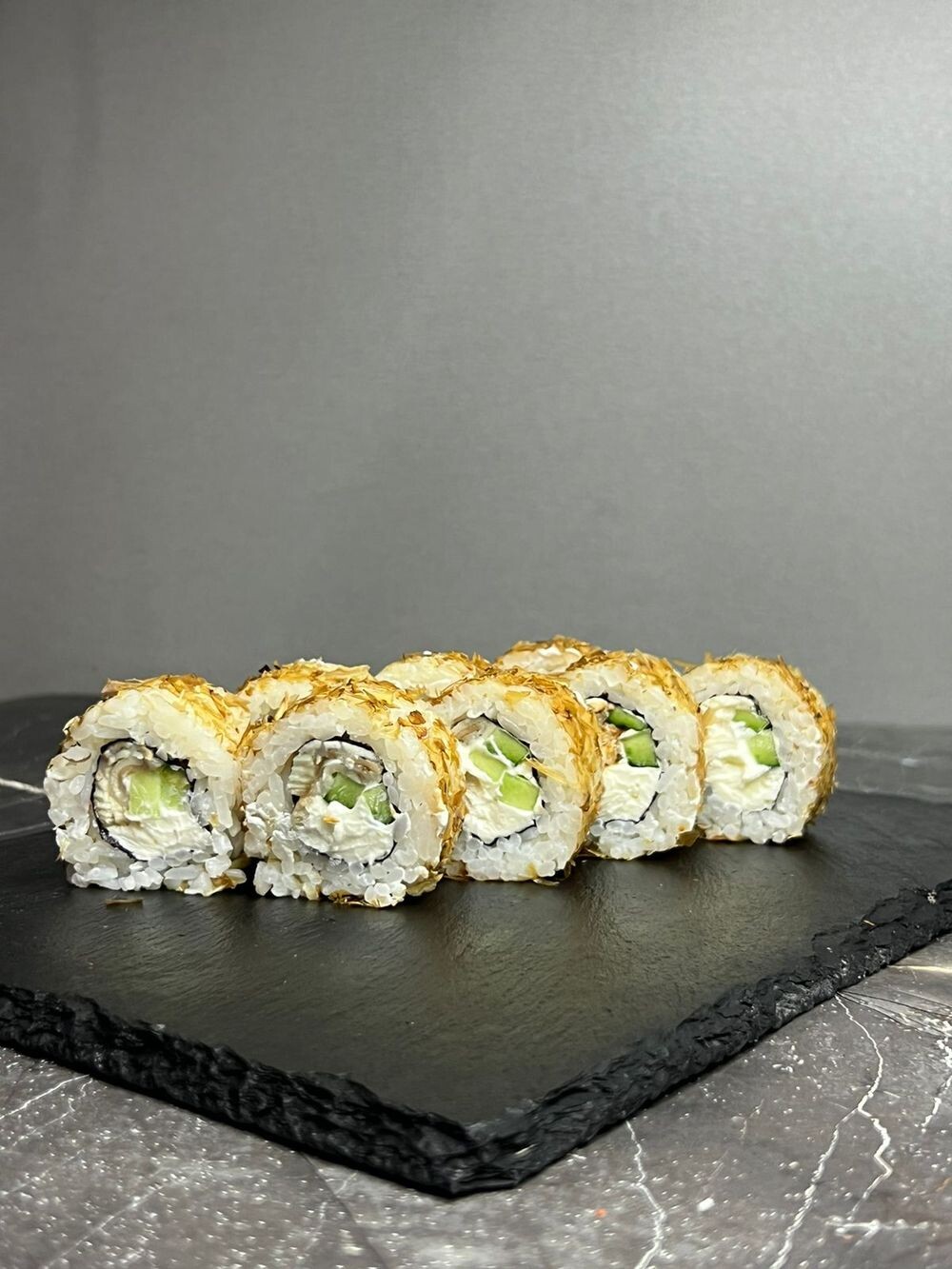 Угорь ,спайс соус огурец,сыр сливочный ,стружка тунца