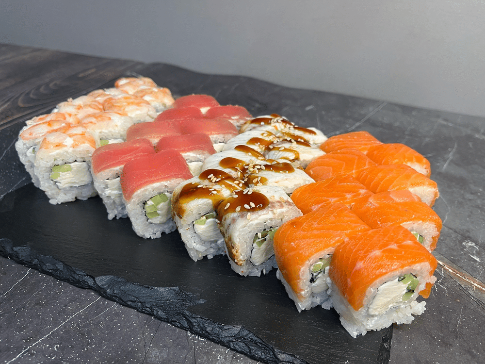 Филадельфия с огурцом, Филадельфия с креветкой, Филадельфия в угре, Филадельфия с тунцом