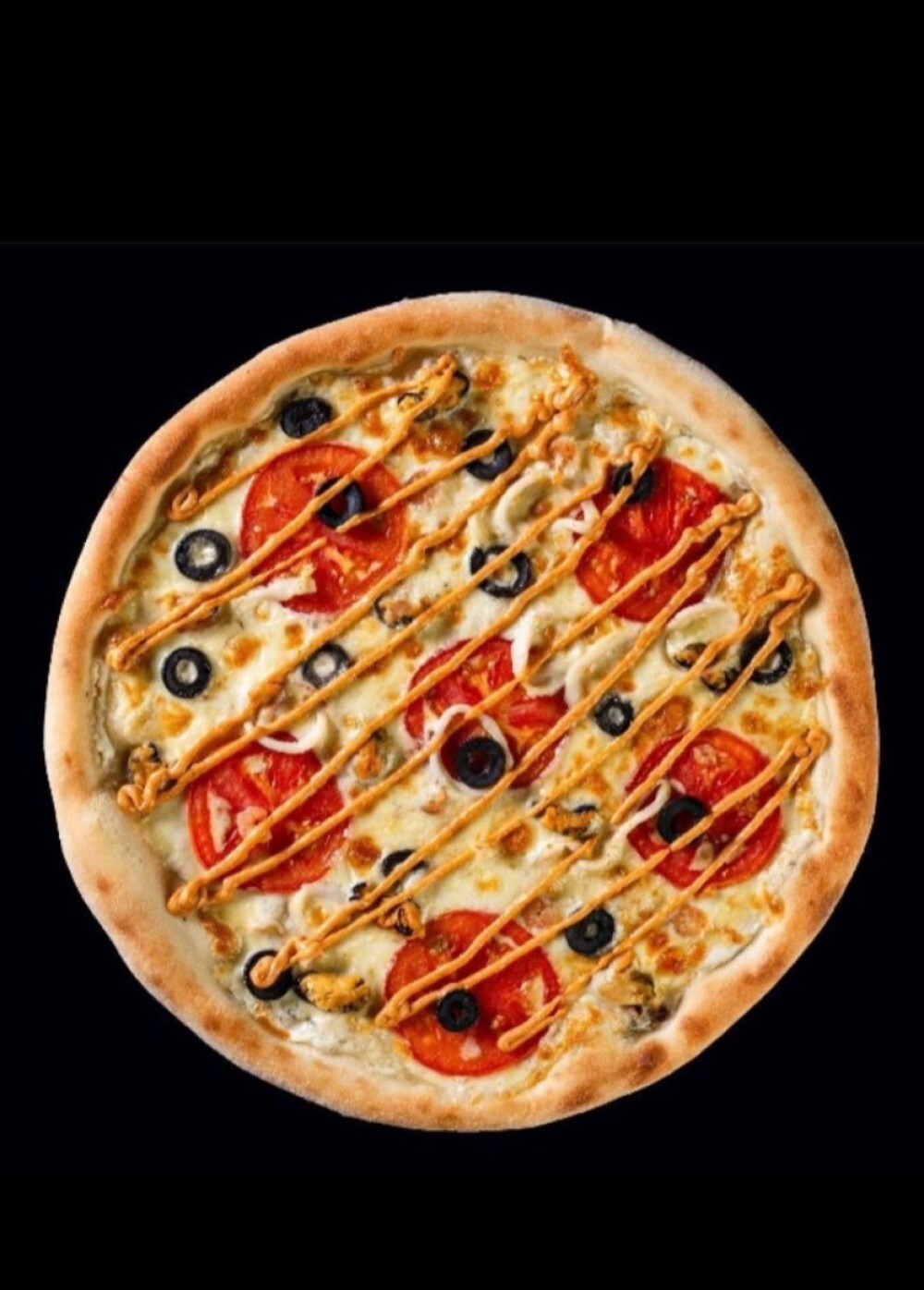 Креветка, лосось, мидии,томаты, маслины,сыр моцарелла,фирменный белый соус, соус том-ям