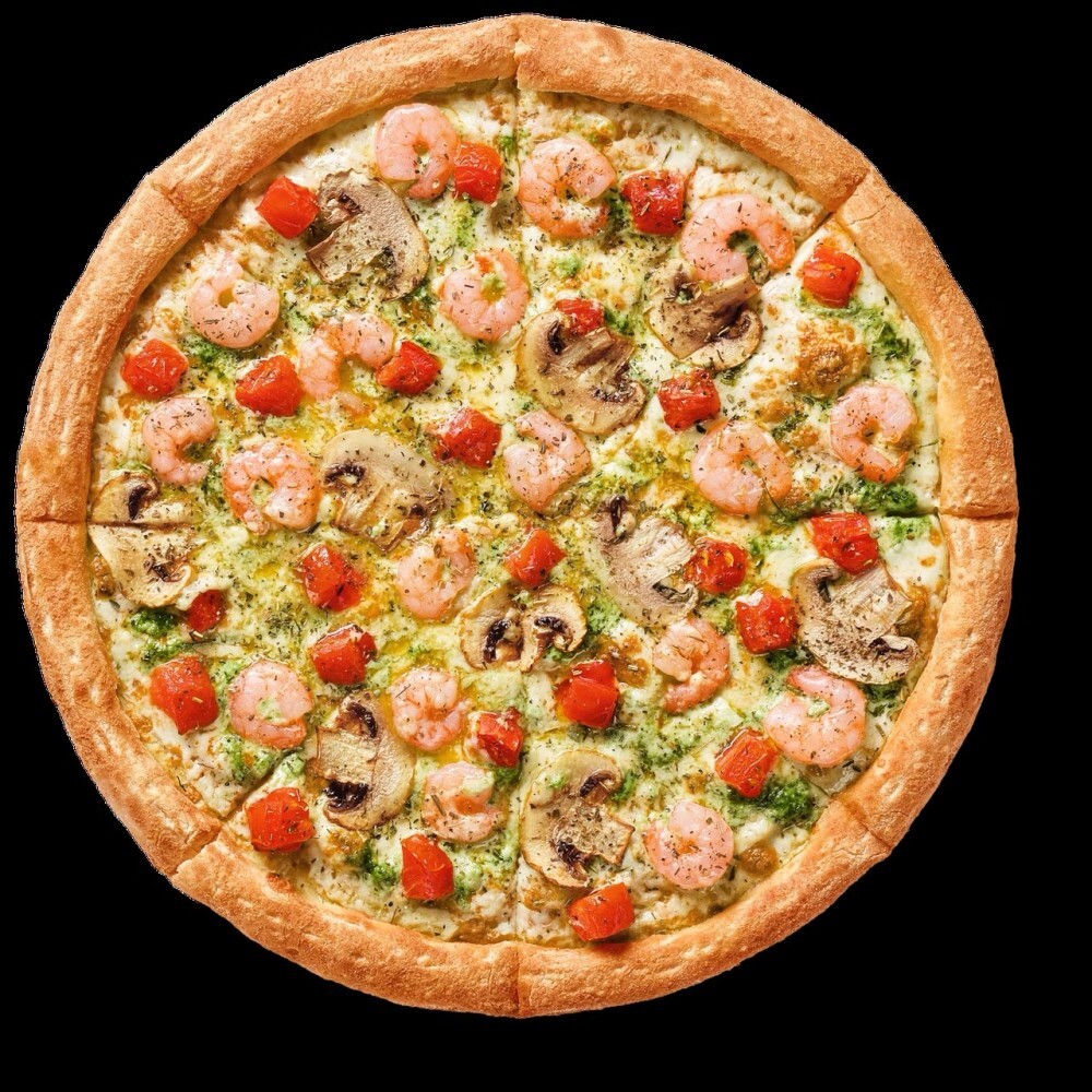 Креветки, томаты, шампиньоны, соус песто, моцарелла, итальянские травы, фирменный томатный соус