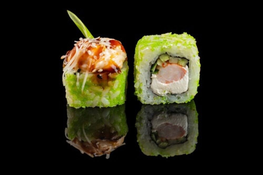 Креветка, сыр Cremette, огурец, сыр пармезан, лук зеленый, масаго зеленая, соус сырный, соус унаги, кунжут